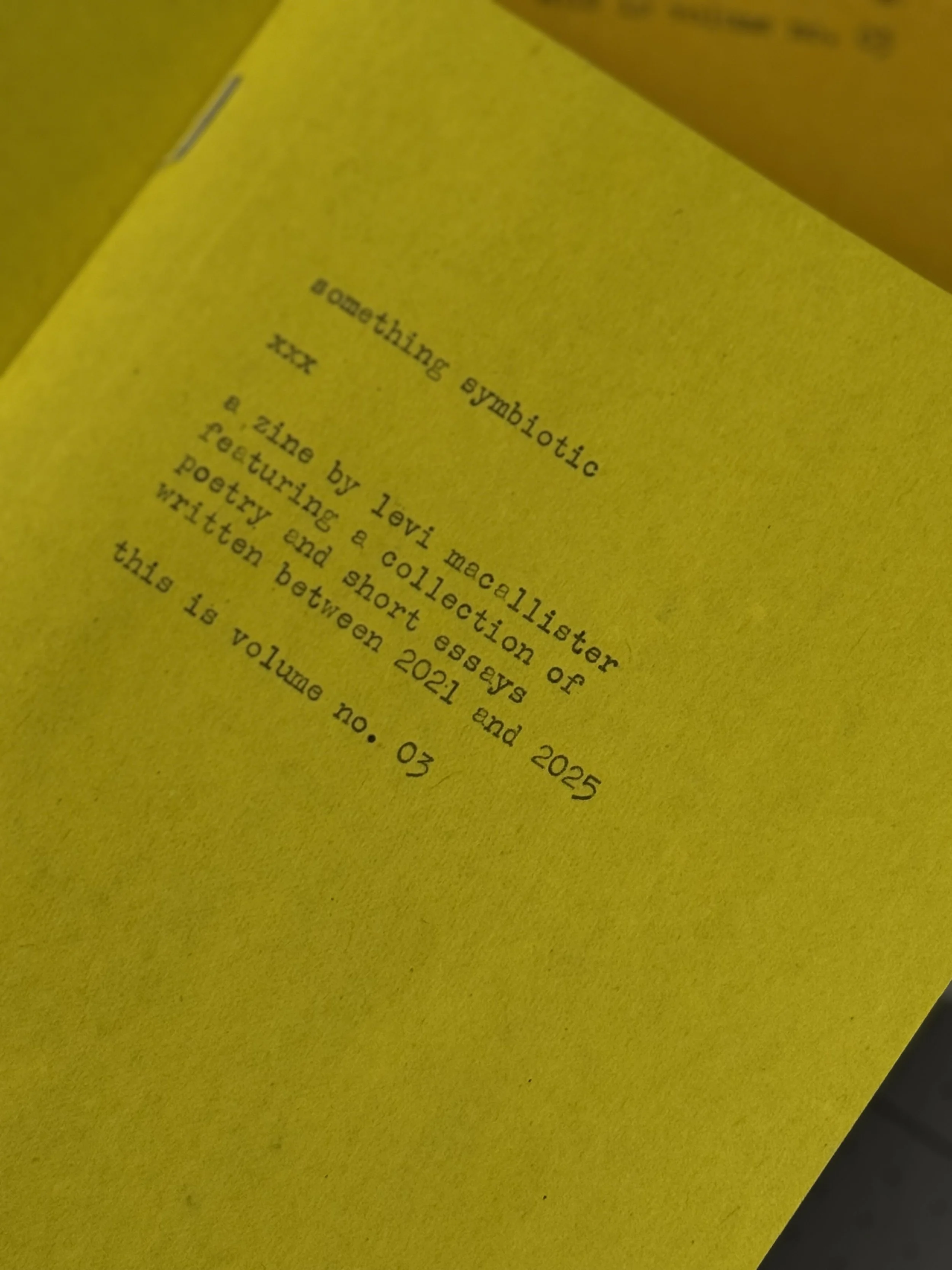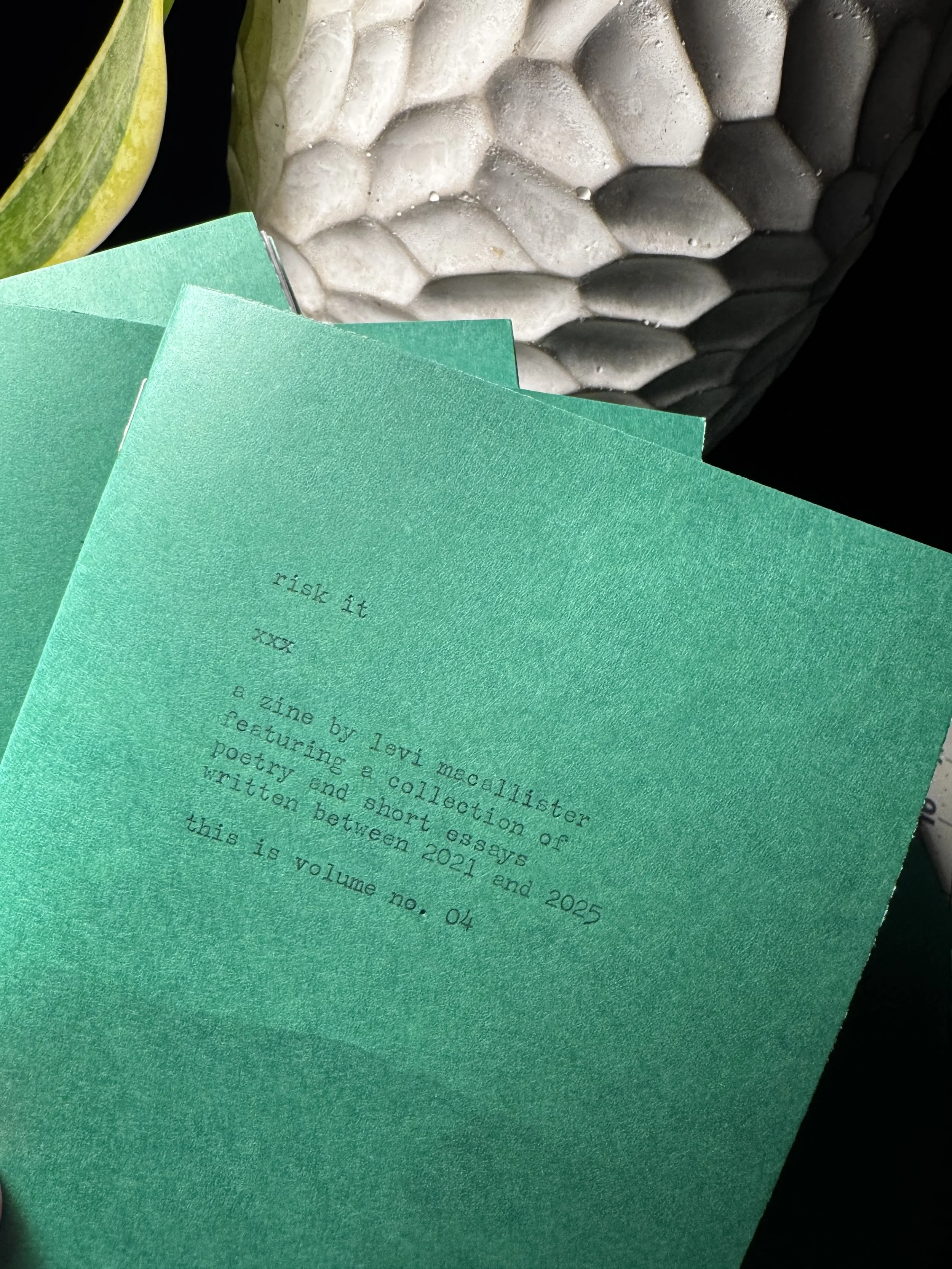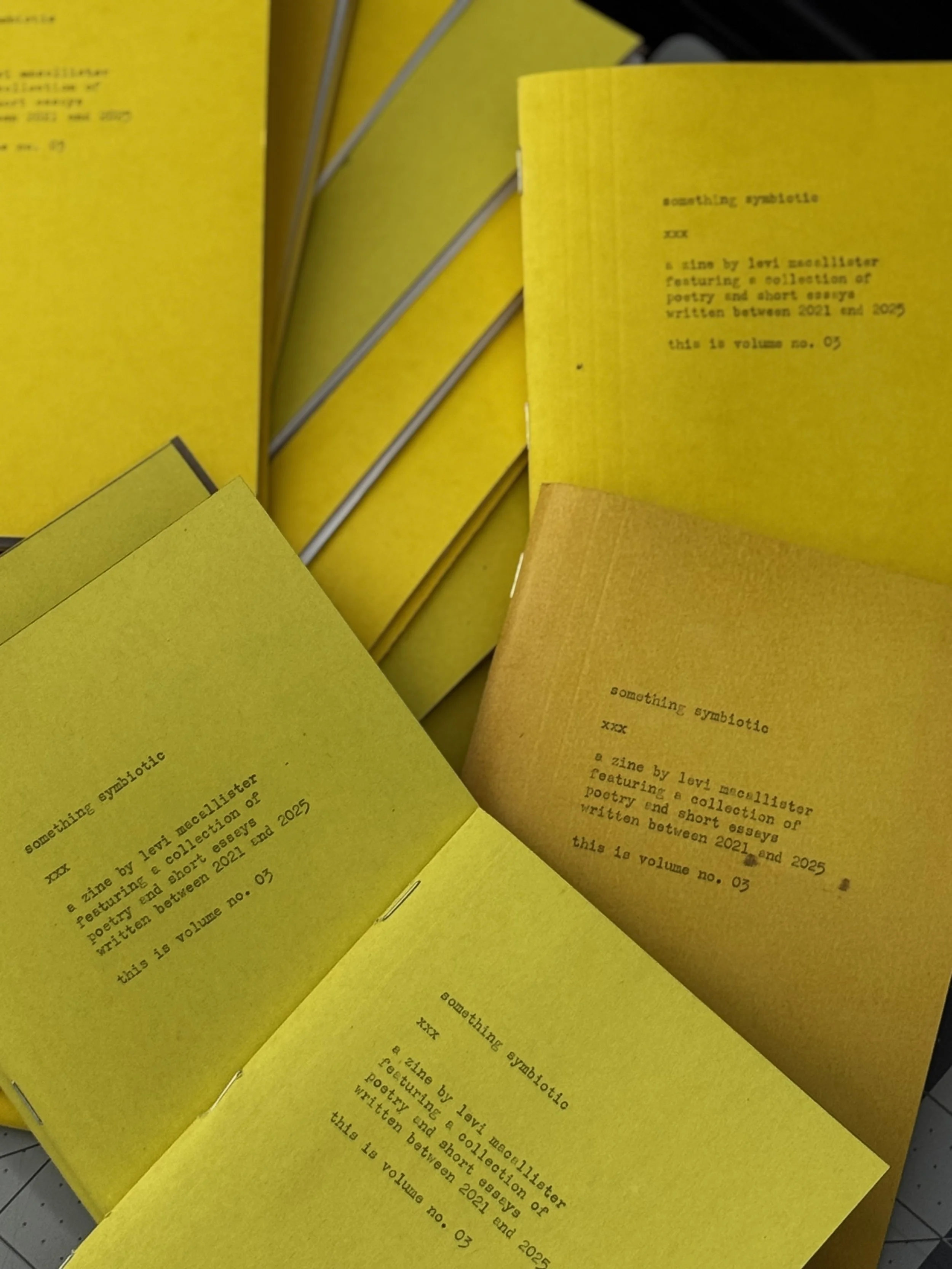 A zine by Levi Macallister, featuring a collection of poetry and short essays written between 2021 and 2025. This is Volume No. 04 of 07, spanning January 19, 2022 - April 8, 2022. There are 25 available.