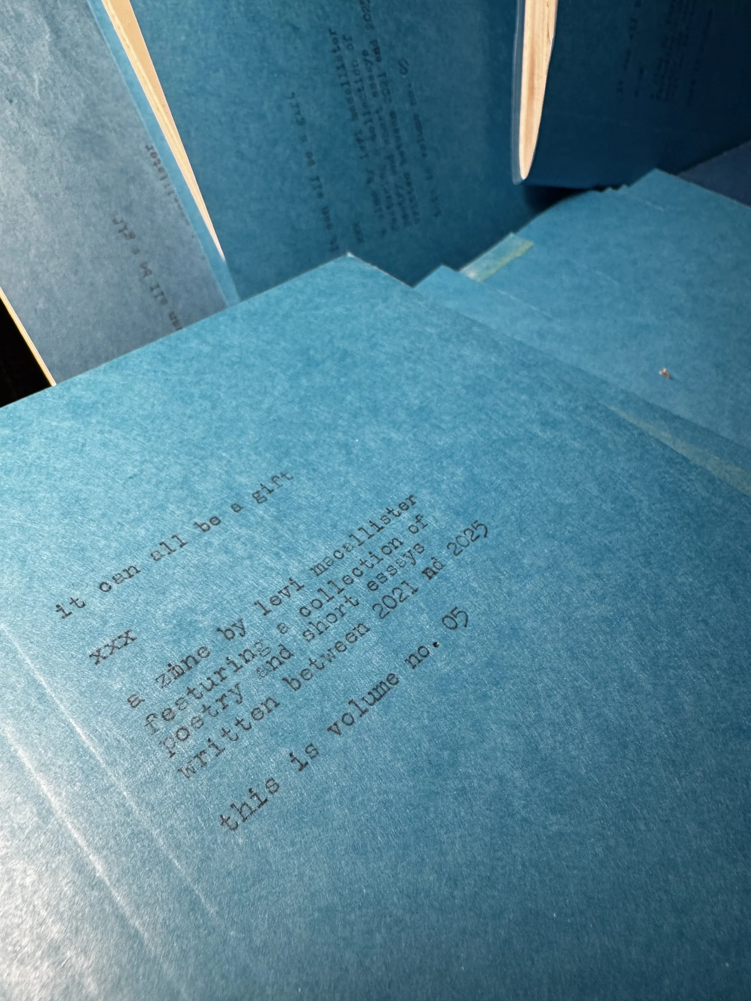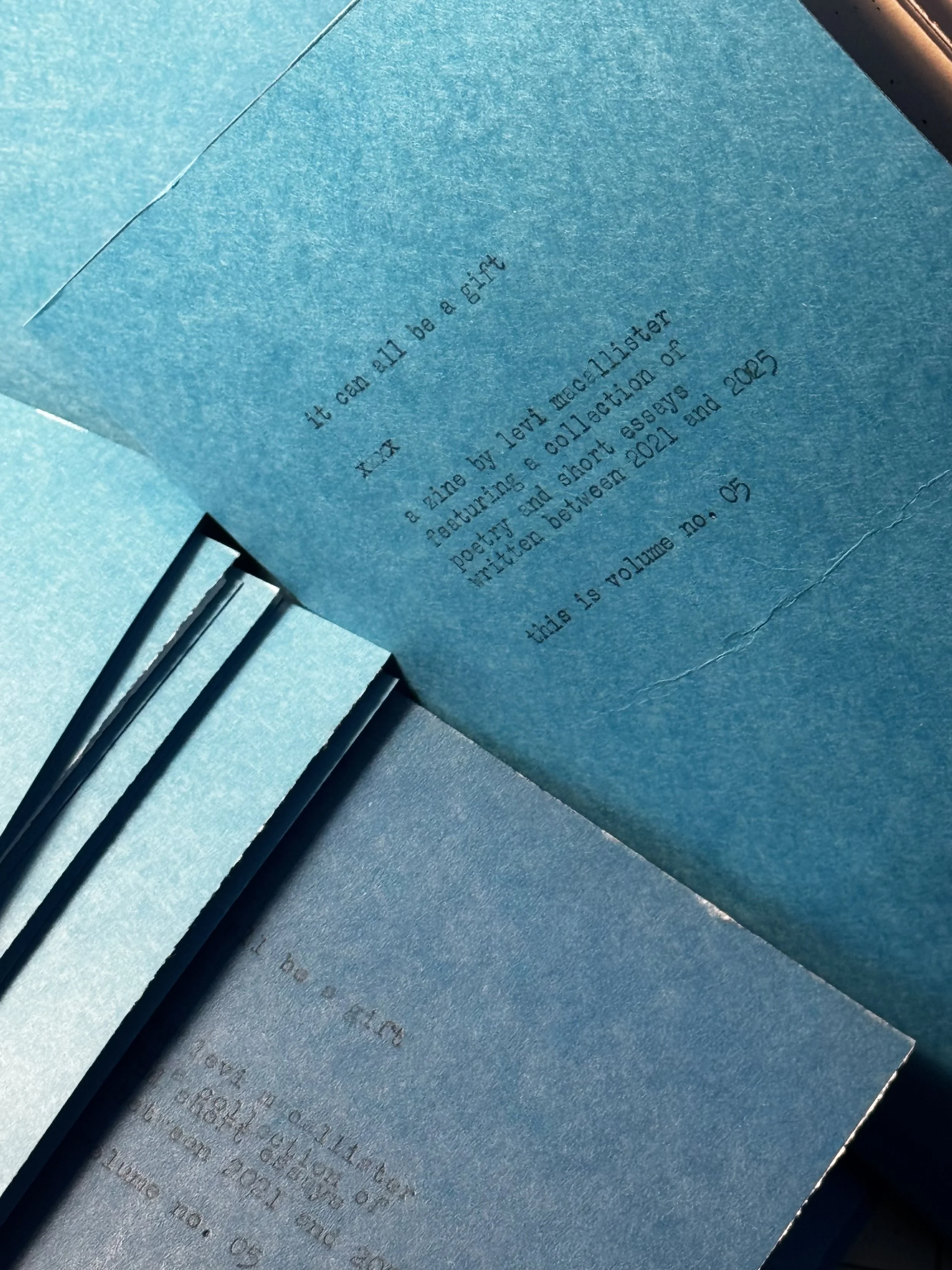 A zine by Levi Macallister, featuring a collection of poetry and short essays written between 2021 and 2025. This is Volume No. 05 of 07, spanning June 13, 2022 - January 24, 2023. There are 25 available.